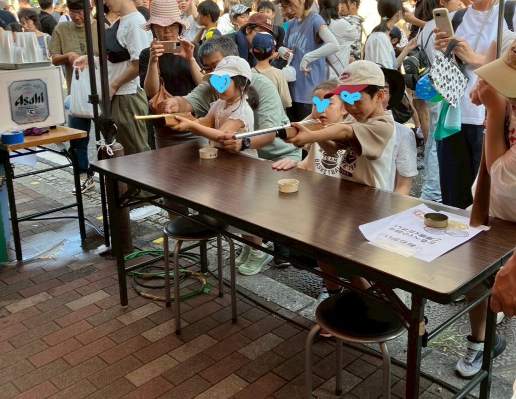 12時からゆうゆうロードの露店が開店 射的のブースは子どもたちでいっぱいです