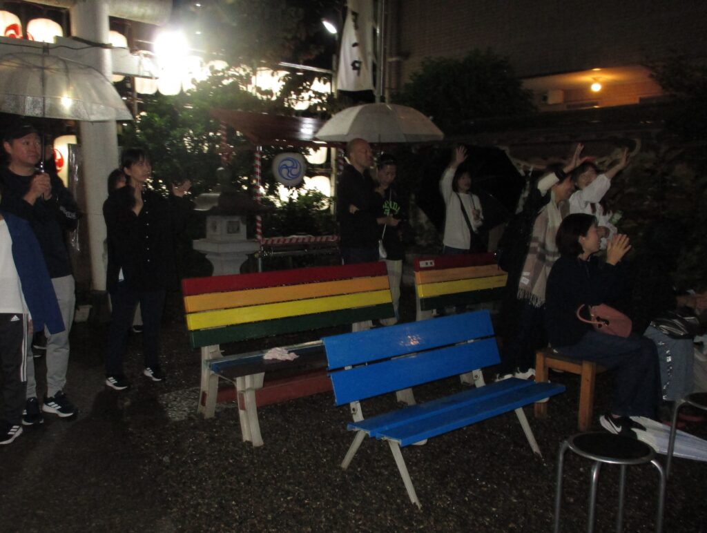 傘を差しながらカラオケ大会を楽しむ人たち