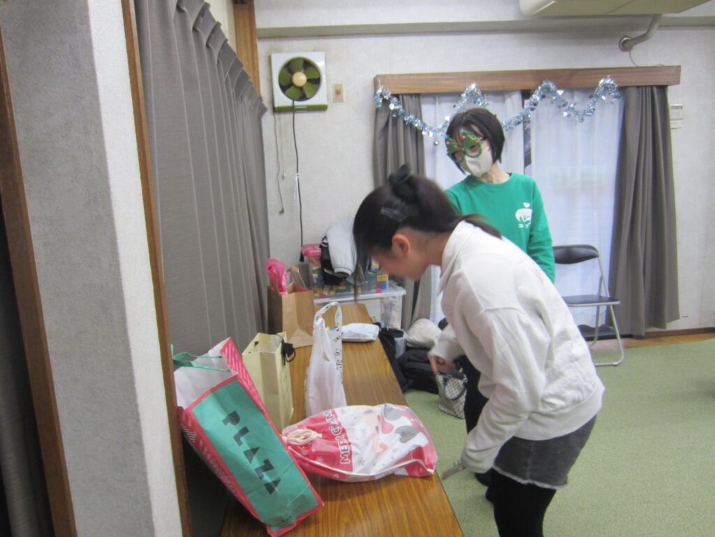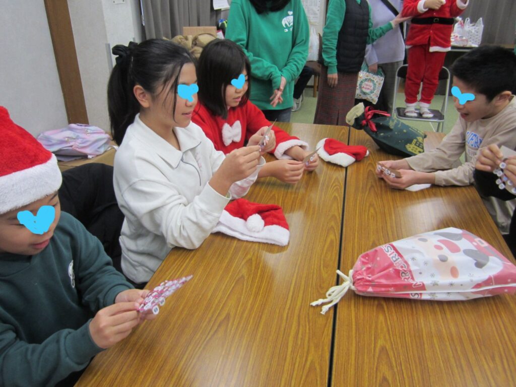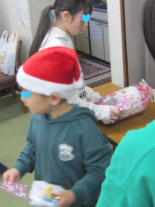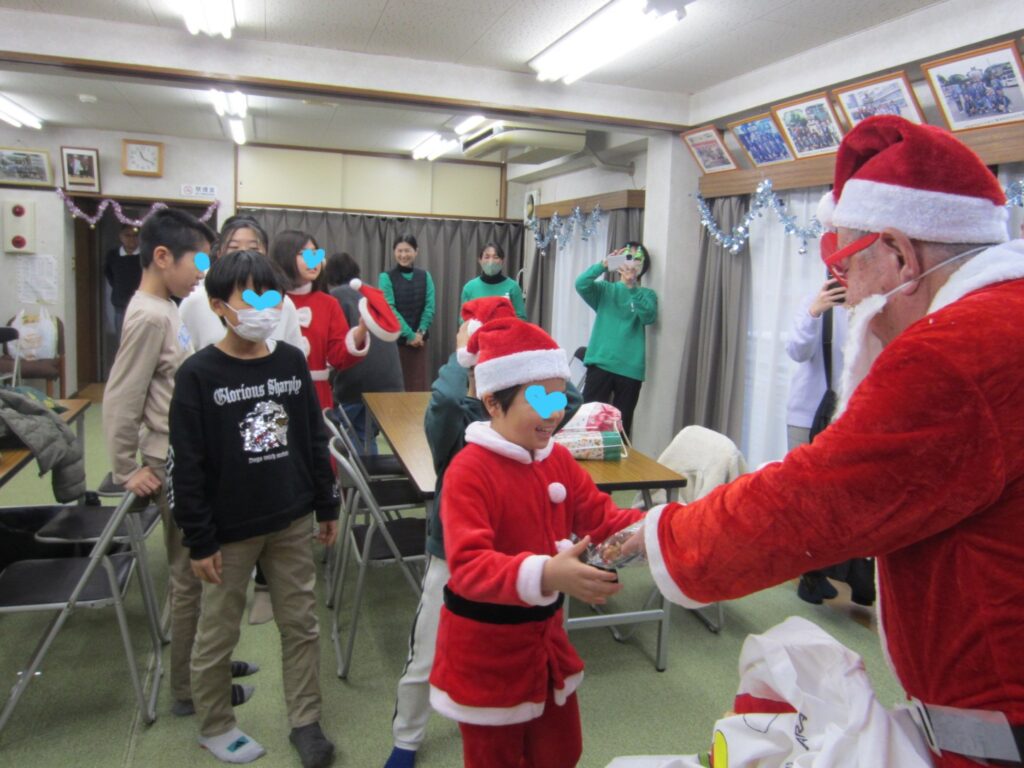 サンタさんから子ども会のみんなへお菓子のプレゼントが渡されました
