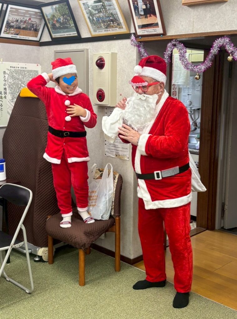 ビンゴゲーム大会が終わると、なんとサンタクロースがやってきました🎅ちびっ子サンタも大喜びです!